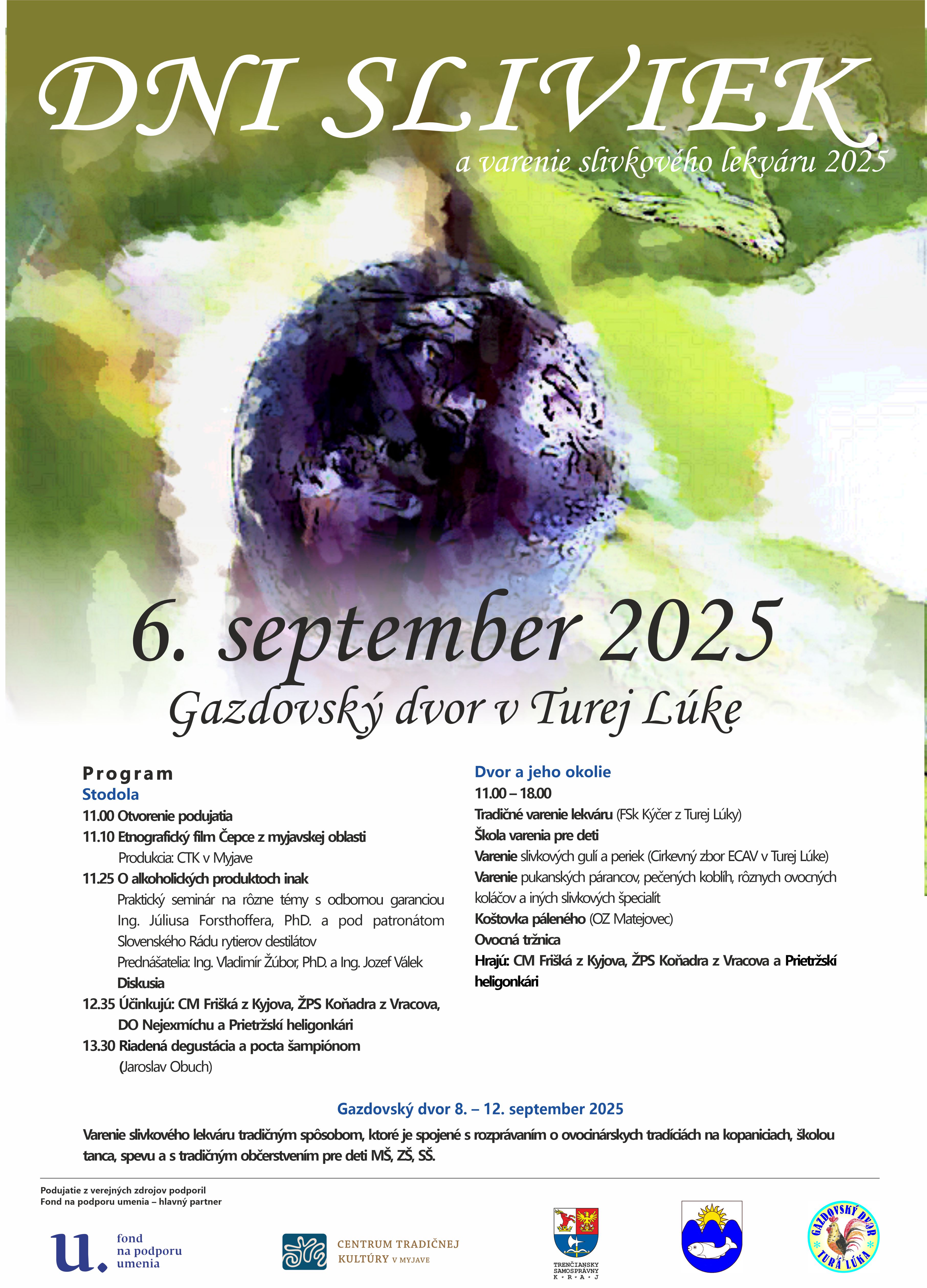 6. 9. sa bude konať podujatie Dni sliviek a varenie slivkového lekváru v Gazdovskom dvore v Turej Lúke. Jednotlivé programy budú prebiehať na 6 scénach. V ponuke je príprava a koštovka jedál zo sliviek, varenie slivkového lekváru tradičnými spôsobmi, ovocná tržnica, gastro zóna, koštovka páleného, degustačné workshopy, pocta šampiónov, seminár s diskusiou a tiež premietanie etnografických filmov. Interaktívne podujatie pre deti MŠ, ZŠ, SŠ bude v termíne od 8. – 12. 09. 2025.