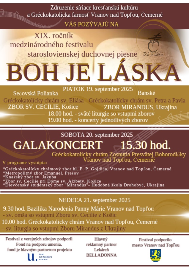 V dňoch 19.9. - 21.9.2025 sa vo Vranove nad Topľou – Čemernom uskutoční XIX. ročník medzinárodného festivalu duchovnej piesne „BOH JE LÁSKA „. Milovníci duchovnej piesne budú mať možnosť si znovu vypočuť prekrásne cirkevné piesne