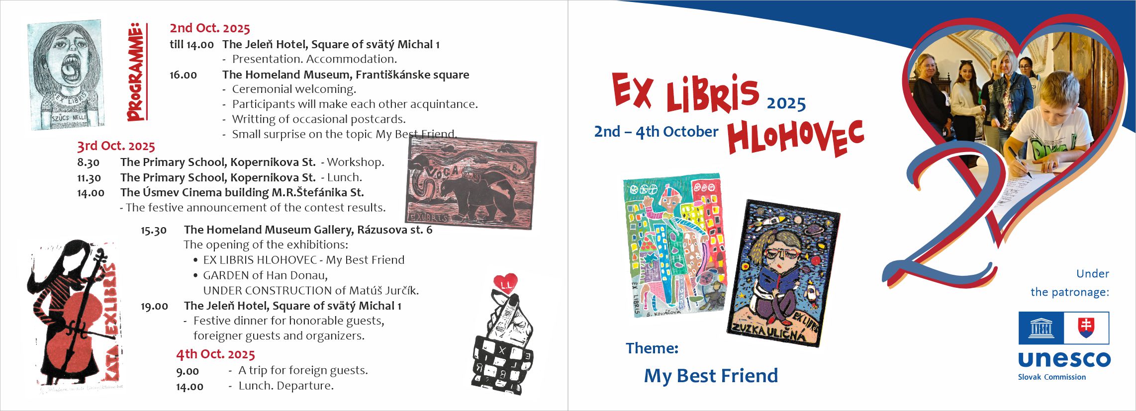 Jubilejný 20. ročník medzinárodnej výtvarnej súťaže EX LIBRIS HLOHOVEC má tému Môj najlepší kamarát. Dvadsať ročníkov súťaže nás nabáda, aby sme sa poohliadli do minulosti. Od prvého ročníka prijalo pozvanie do súťaže 27340 detí z 30 krajín sveta. To znamená okrem tisícov malých umeleckých diel najmä stovky priateľstiev, ktoré vďaka našej súťaži vznikli. Slávnostné vyhlásenie výsledkov 20. ročníka sa bude konať 2. - 4.10.2025.