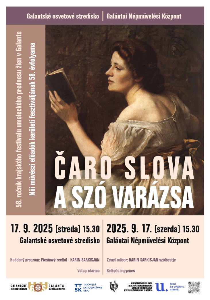 Galantské osvetové stredisko vás pozýva na 58. ročník krajského festivalu umeleckého prednesu žien pod názvom Čaro slova, ktorý sa uskutoční dňa 17. septembra 2025 v priestoroch Galantského osvetového strediska. Podujatie z verejných zdrojov podporil Fond na podporu umenia, ktorý je aj hlavným partnerom podujatia. Súčasťou festivalu bude prezentácia vydanej autorskej tvorby recitátoriek a hudobný piesňový recitál v podaní výnimočnej umelkyne Karin Sarkisjan, pochádzajúcej z Arménska.