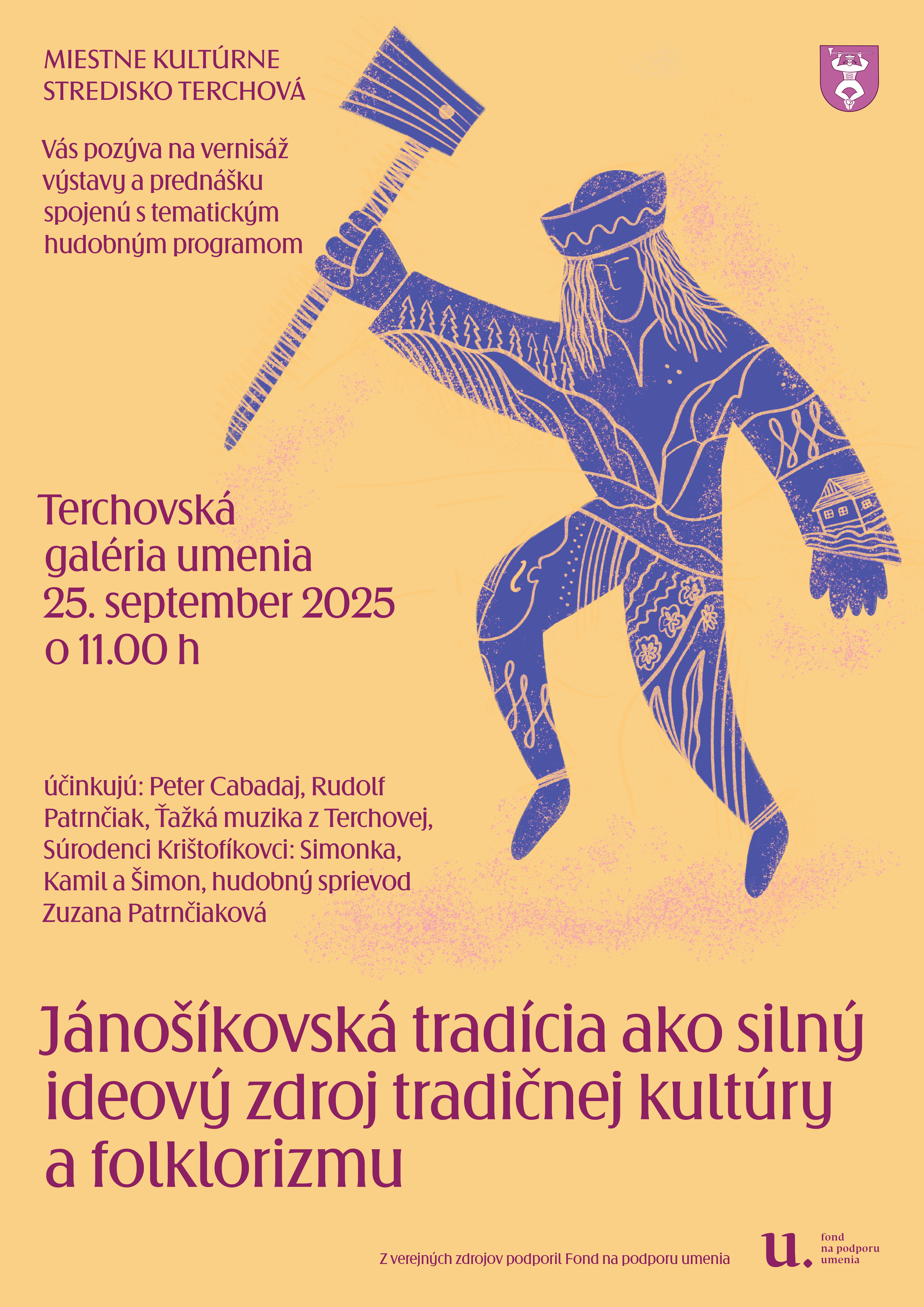 Miestne kultúrne stredisko Terchová vás pozýva na vernisáž výstavy a prednášku spojenú s tematickým hudobným programom vo štvrtok 25.09.2025 o 11.00h do Terchovskej galérie umenia v Terchovej. Účinkujú: Peter Cabadaj, Rudolf Patrnčiak, Ťažká muzika z Terchovej, Súrodenci Krištofíkovci: Simonka, Kamil a Šimon, hudobný sprievod Zuzana Patrnčiaková