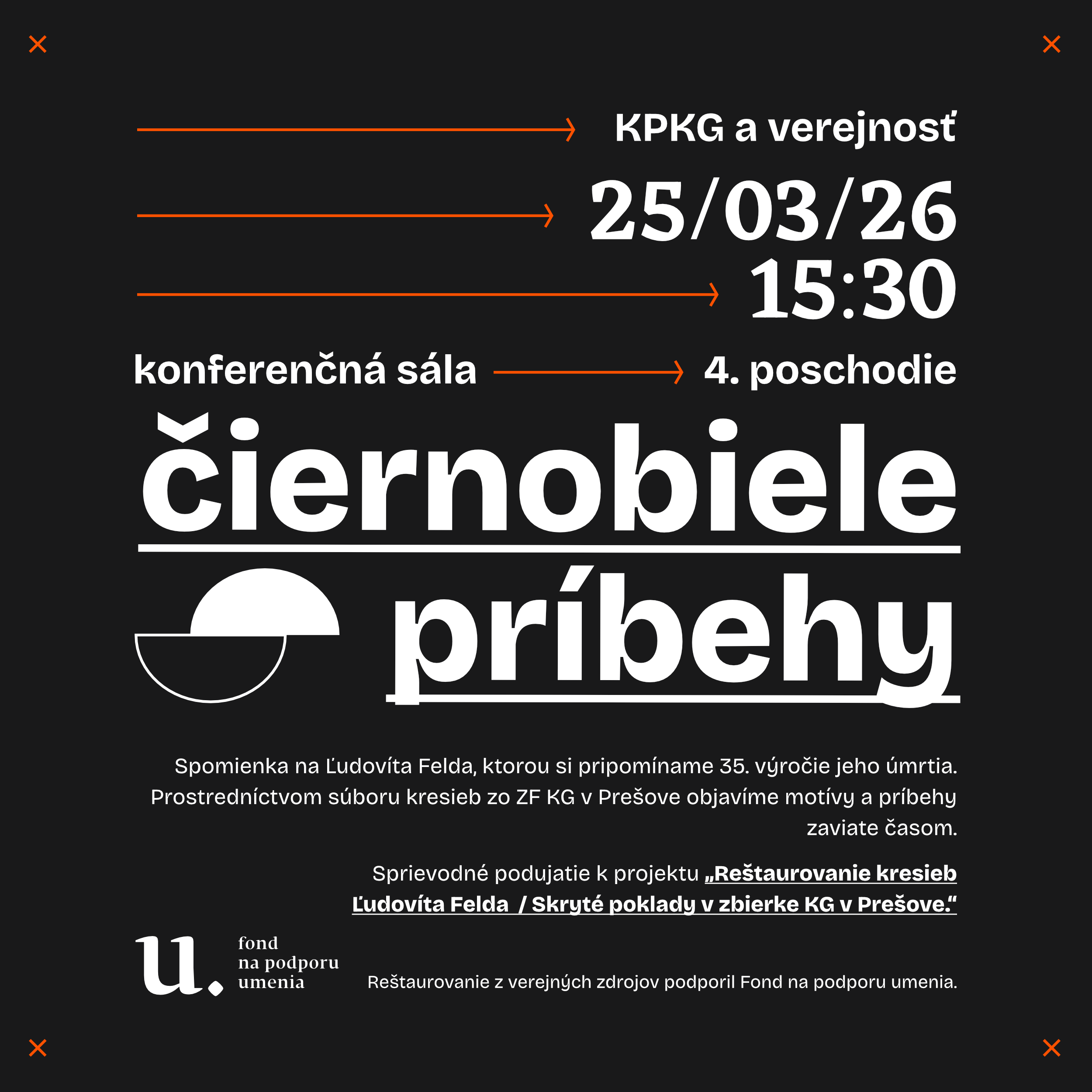 Spomienka na Ľudovíta Felda, ktorou si pripomíname 35. výročie jeho úmrtia. Prostredníctvom súboru kresieb zo ZF KG v Prešove objavíme motívy a príbehy zaviate časom. Sprievodné podujatie k projektu „Reštaurovanie kresieb Ľudovíta Felda/ Skryté poklady v zbierke KG v Prešove“. Reštaurovanie z verejných zdrojov podporil Fond na podporu umenia.
