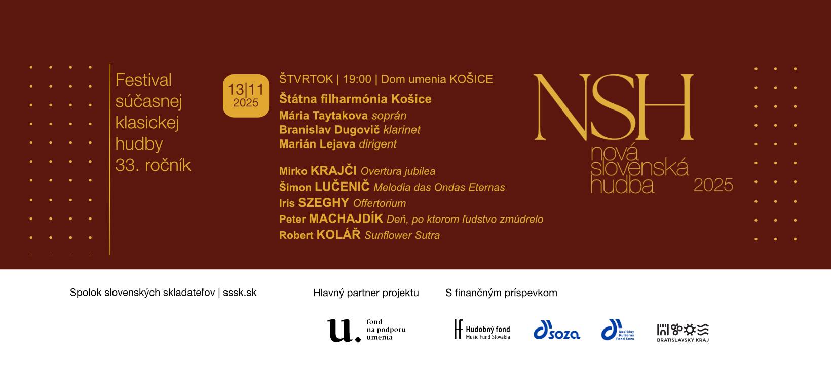 V rámci festivalu Nová slovenská hudba uvedie Štátna filharmónia Košice pod taktovkou Mariána Lejavu orchestrálnu skladbu názvom Deň, po ktorom ľudstvo zmúdrelo, ktorej vznik z verejných zdrojou formou štipendia podporil Fond na podporu umenia. Koncert sa uskutoční v Dome umenia v Košiciach s bude nahrávaný Slovenským rozhlasom.