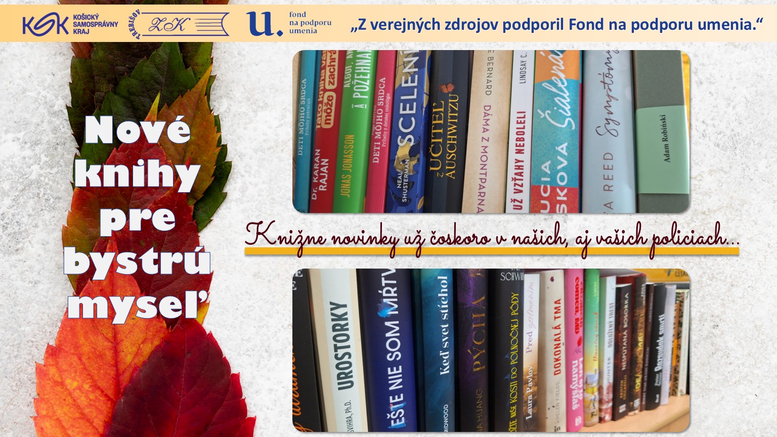Hlavným cieľom nákupu nových knižničných jednotiek je pravidelná a systematická obnova knižničného fondu, ktorá reflektuje aktuálne potreby a záujmy našich čitateľov. Vďaka finančnej podpore z Fondu na podporu umenia môžeme do knižnice zakúpiť literatúru, ktorá pokrýva široké spektrum žánrov – od pôvodnej slovenskej tvorby a kvalitných prekladov svetovej beletrie až po odborné publikácie a populárno-náučnú literatúru pre všetky vekové kategórie používateľov.