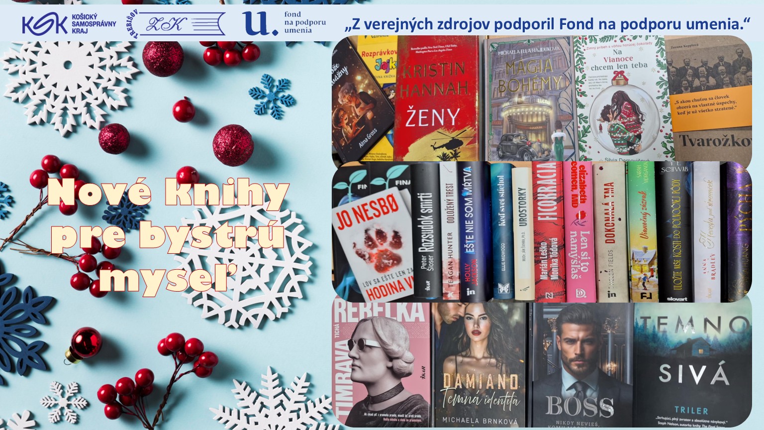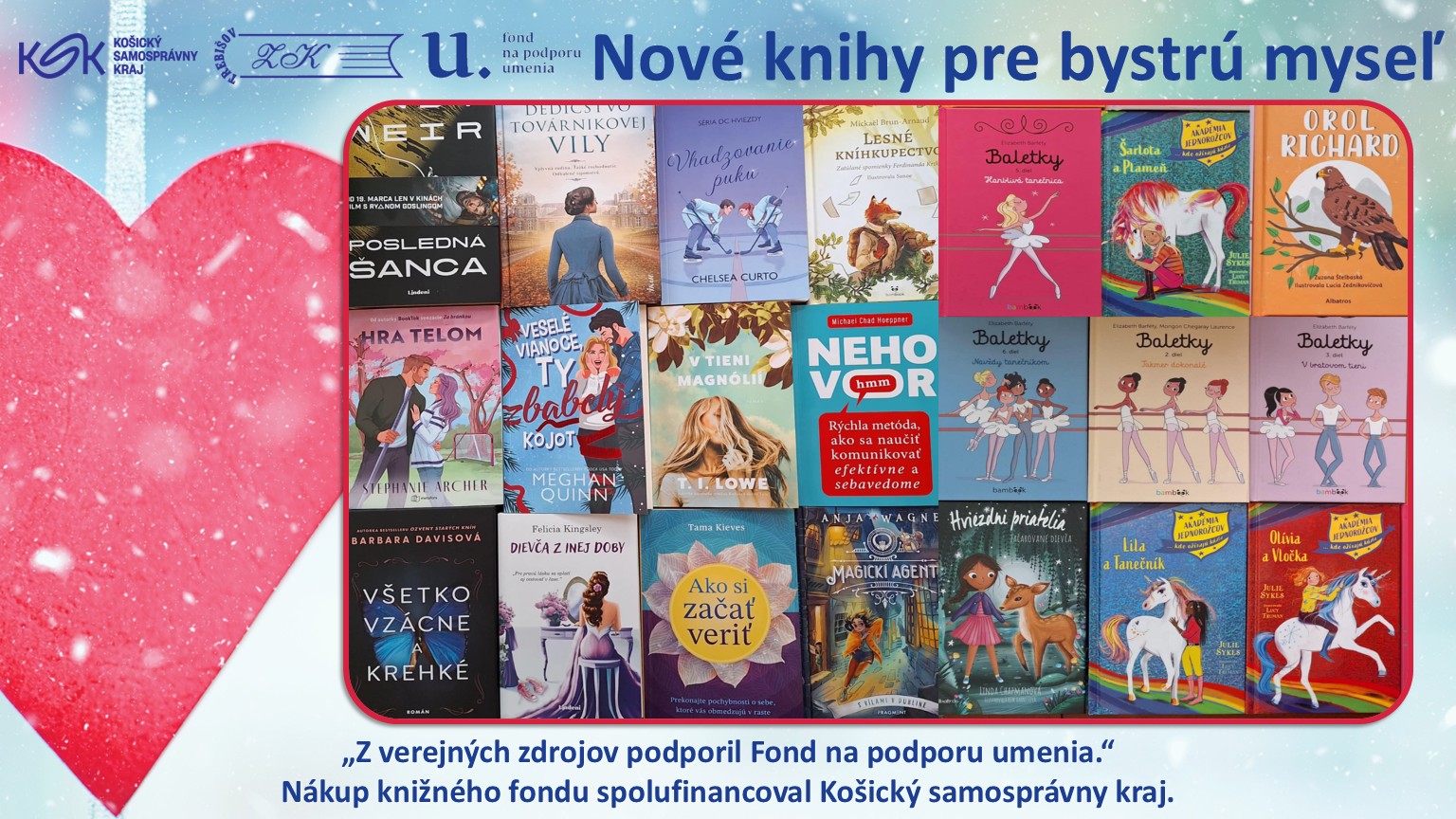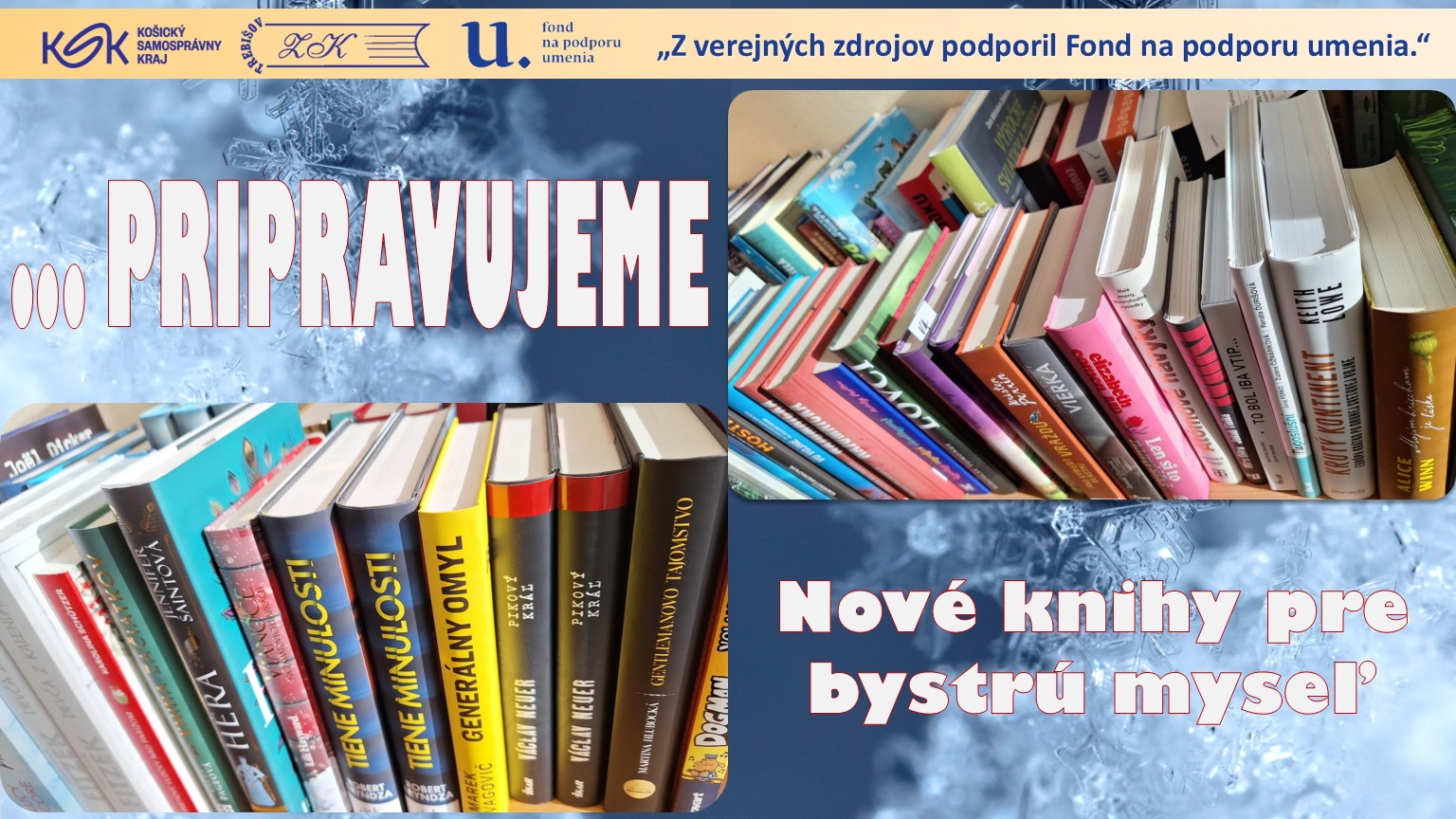 Hlavným cieľom nákupu nových knižničných jednotiek je pravidelná a systematická obnova knižničného fondu, ktorá reflektuje aktuálne potreby a záujmy našich čitateľov. Vďaka finančnej podpore z Fondu na podporu umenia môžeme do knižnice zakúpiť literatúru, ktorá pokrýva široké spektrum žánrov – od pôvodnej slovenskej tvorby a kvalitných prekladov svetovej beletrie až po odborné publikácie a populárno-náučnú literatúru pre všetky vekové kategórie používateľov.